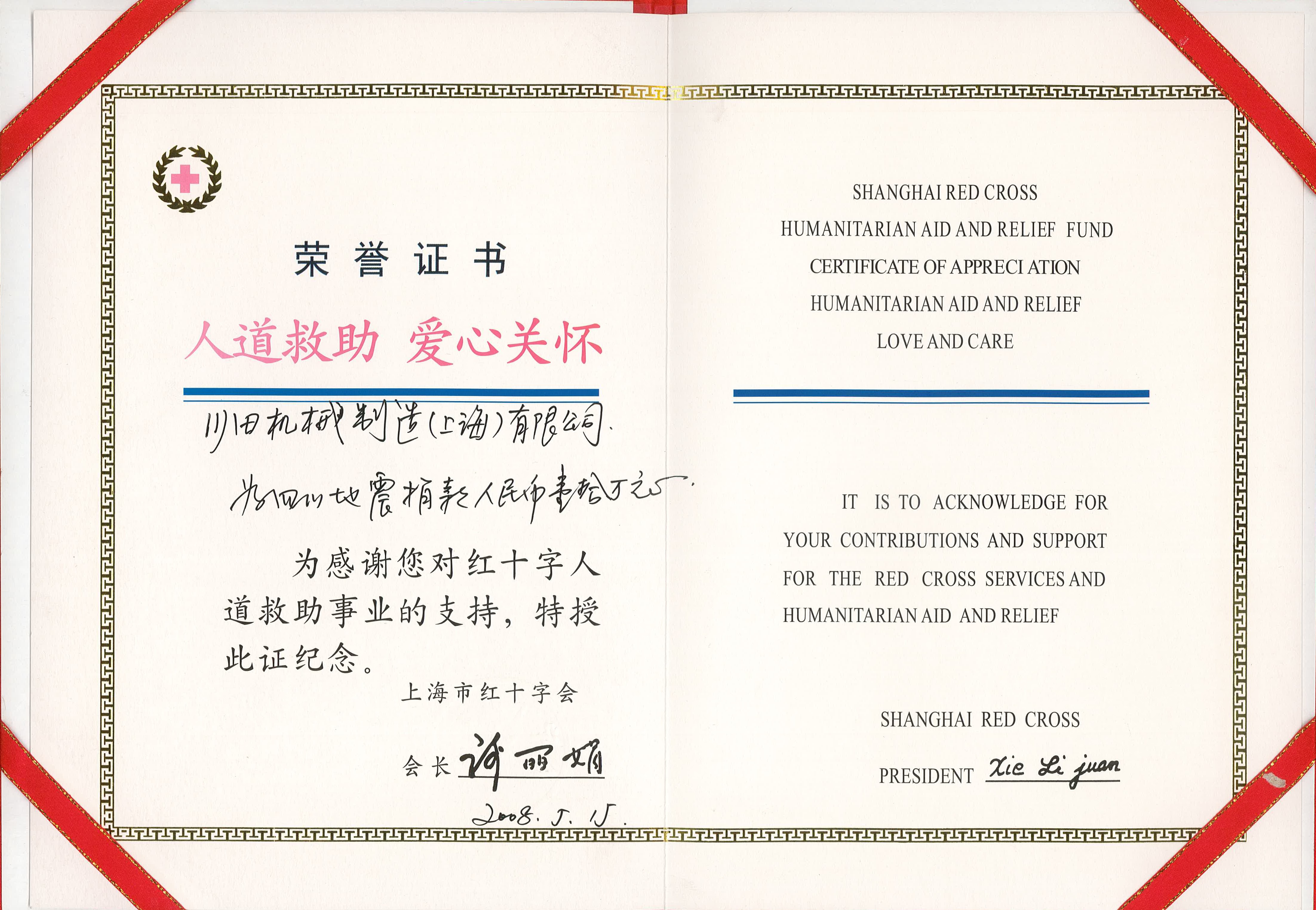 2008年度上海市赤十字栄譽(yù)証書-川田機(jī)械